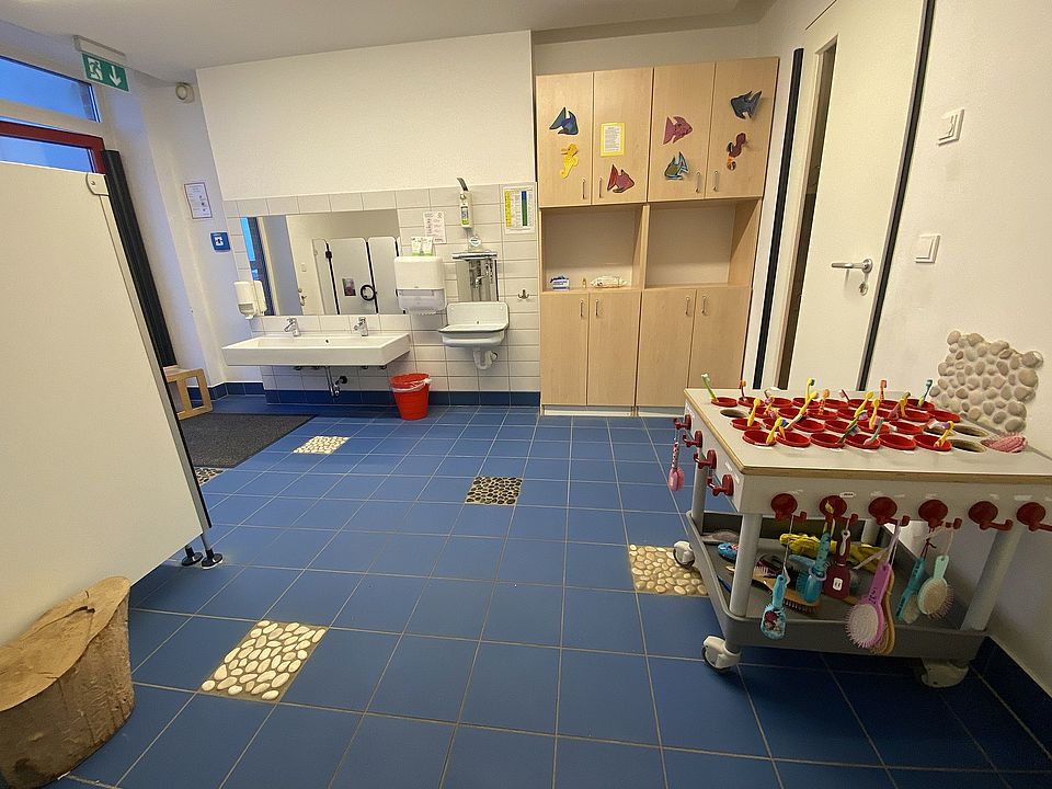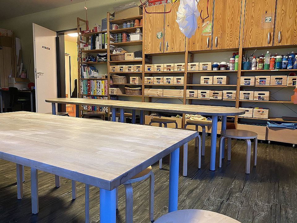Die kindgerechten Guppen- und Funktionsräume, wie das Atelier, die Holzwerkstatt, die Lernwerkstatt sowie der Bauraum und die Küche wurden liebevoll eingerichtet und laden die Kinder ein zum gemeinsamen Basteln, Erkunden, Malen oder Kochen.