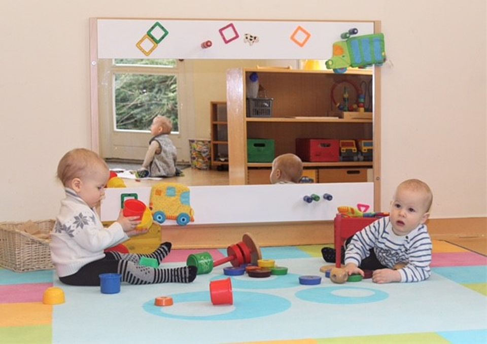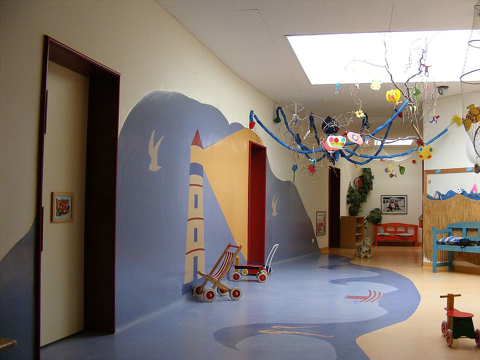 Der Krippenbereich umfasst drei Krippengruppenräume für je sechs Kinder. In diesem Bereich finden sich eine Küchenzeile, ein Krippenschlafraum und ein Sanitärbereich.