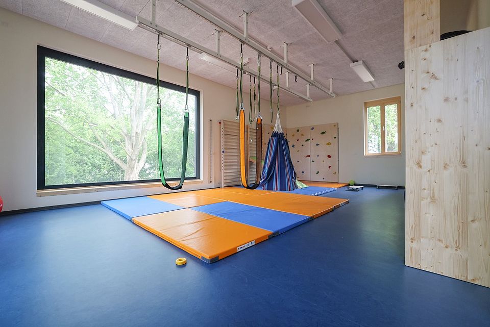 Der große Sportraum lädt zum Klettern, Turnen und Spielen ein und die Elemente der Firma „Ullewaeh“ bieten ganz besondere Möglichkeiten.