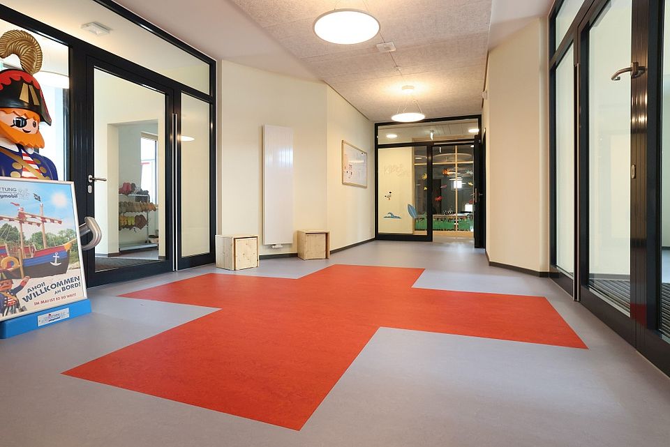 Das Haus bietet auf 1.276 m² Platz für 24 Krippen- und 60 Kindergartenkinder im Alter von einem bis sechs Jahren. Das Herzstück des weitläufigen Außengeländes ist das Piratenschiff von der Stiftung Playmobil.