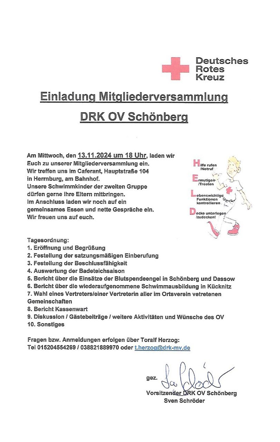 Weitere Informationen und Auskünfte erhaltet ihr bei Sven Schröder oder über den Ehrenamtskoordinator Jan Kolander in Grevesmühlen (Tel.: 0173 524 31 08)